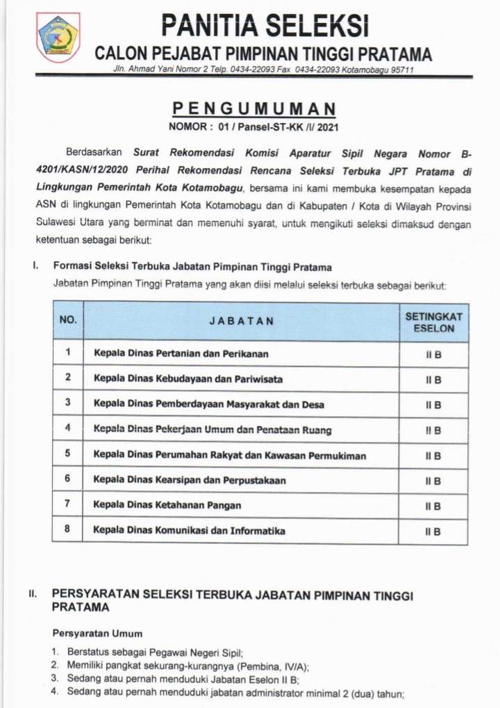 SUARASULUT.COM,KOTAMOBAGU – Pemkot Kotamobagu dalam waktu dekat akan melaksanakan seleksi terbuka calon pejabat tinggi pratama. Digelarnya seleksi terbuka ini, setelah Pemkot mendapat surat rekomendasi dari Komisi Aparatur Sipil Negara (KASN).