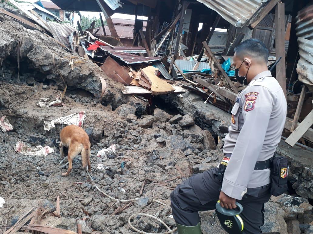 Evakuasi dilakukan dengan menggunakan alat berat dibantu dengan pelacakan oleh anjing pelacak K-9 Ditsamapta Polda Sulut.