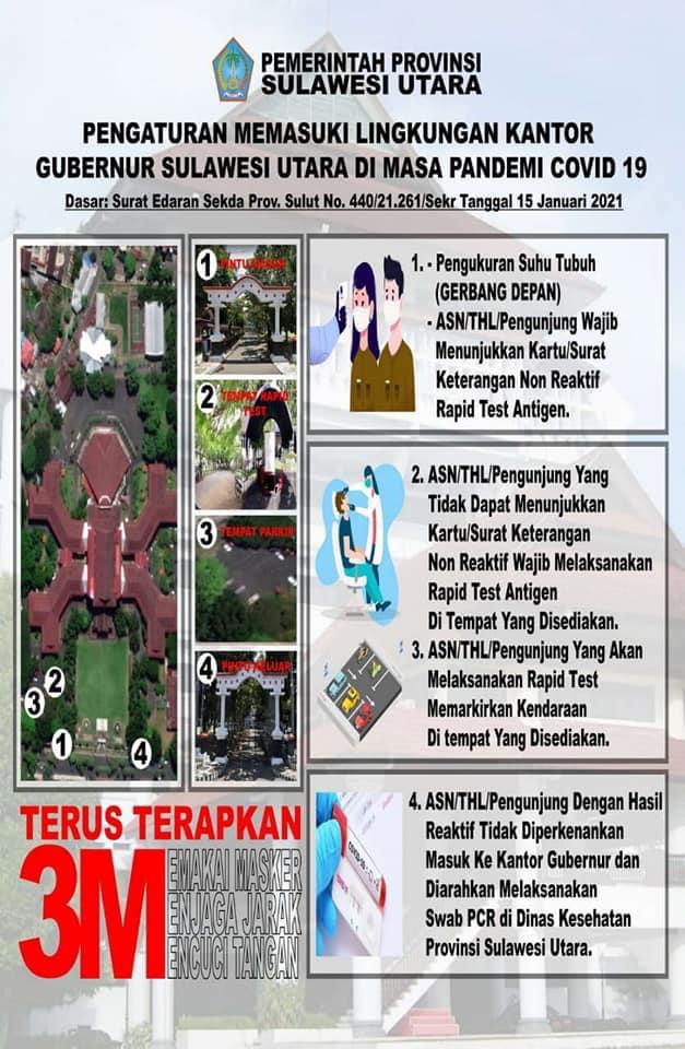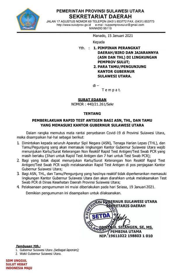 SUARASULUT.COM,MANADO–Berdasarkan Surat Edaran Sekretaris Daerah Provinsi Sulawesi Utara Nomor: 440/21.261/Sekr tanggal 15 Januari 2021, tentang Pemberlakuan Rapid Tes Antigen bagi ASN, THL dan Tamu yang memasuki Kantor Gubernur Sulawesi Utara.