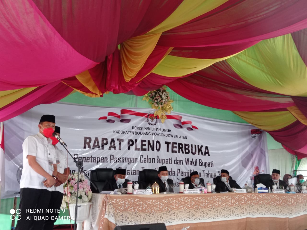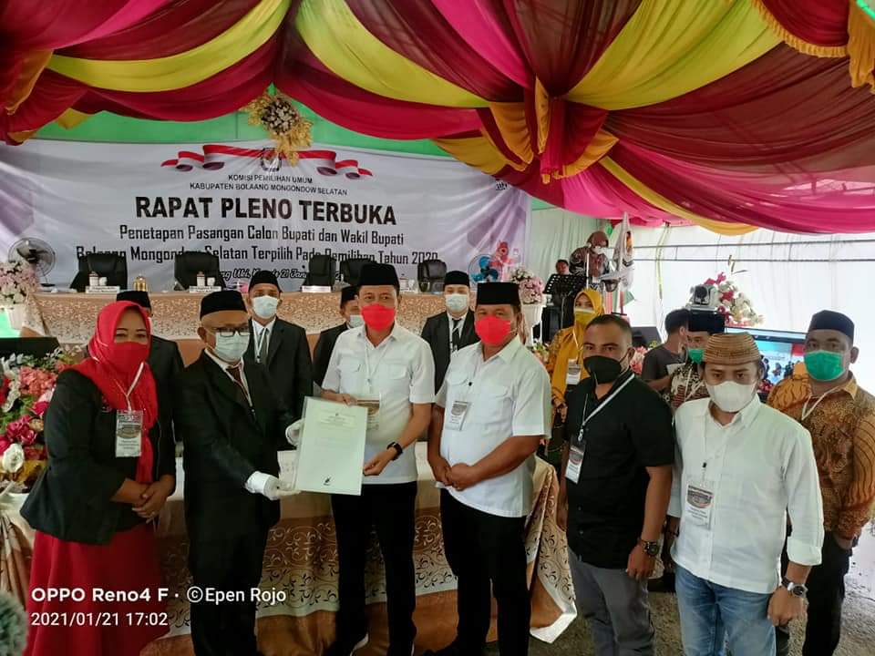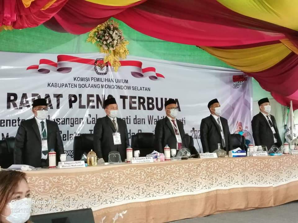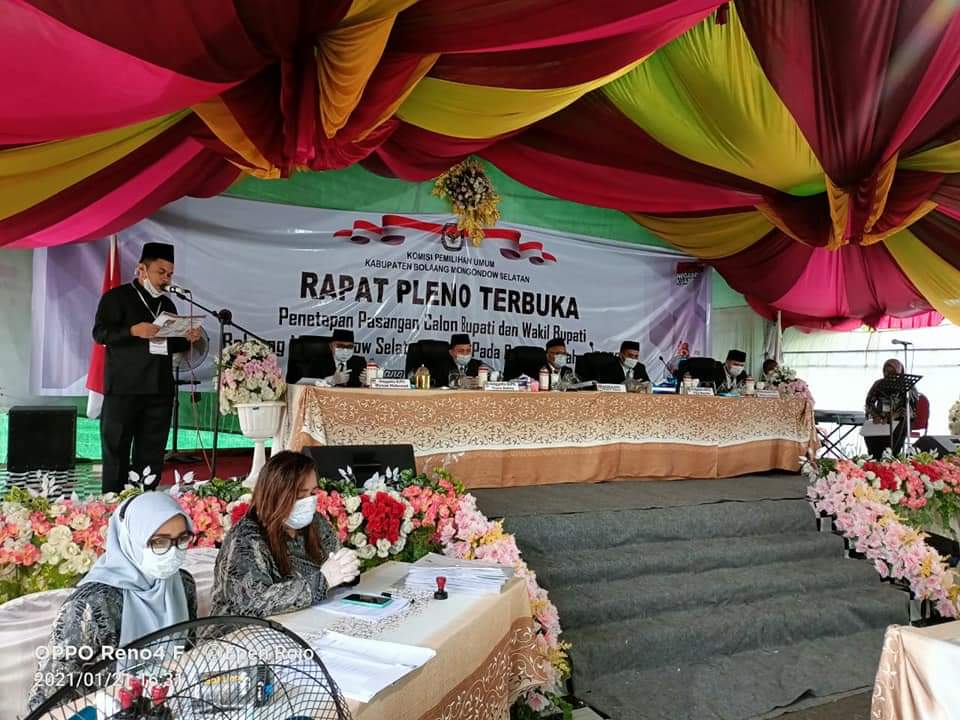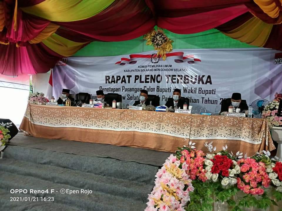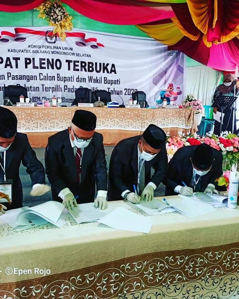 Ketua KPU Bolsel mengatakan, Penetapan Paslon berdasarkan berita acara nomor 02/PL, 02 7-BA/7111/Kab/I/2021, tentang penetapan calon bupati dan wakil bupati Bolaang Mongondow Selatan tahun 2020, di tanda tangani Komisioner KPU Bolsel.