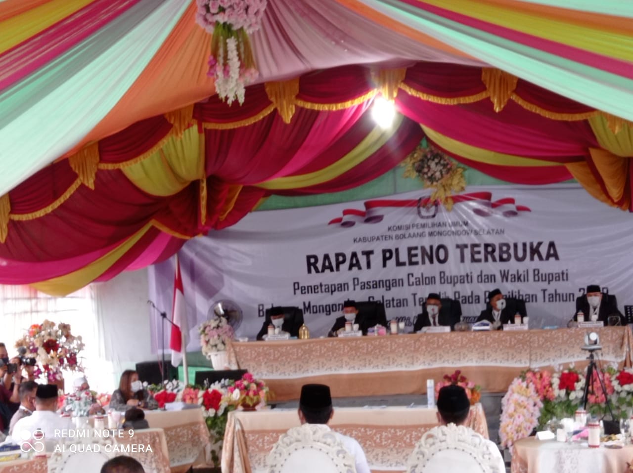 SUARASULUT.COM -BOLSEL, Komisi Pemilihan Umum (KPU) Kabupaten Bolaang Mongondow Selatan, laksanakan rapat pleno terbuka penetapan pasangan calon (Paslon) Bupati dan Wakil Bupati Kabupaten Bolaang Mongondow Selatan terpilih pada Pilkada Tahun 2020.