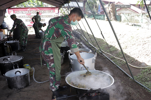Di dapur lapangan yang digelar, personel TNI dan Polri menyiapkan makanan siap santap bagi para warga Kota Manado yang terkena dampak bencana alam banjir dan tanah longsor.