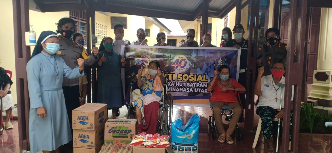 SUARASULUT.COM,MINUT – Penghuni Panti Sosial Tresna Werdha Bethania Desa Paslaten dan Panti Sosial Lansia Suster St. Ana Desa Lembean sumringah menyambut kunjungan dari Ibu Kapolres Minut AKBP Grace K. D Rahakbau SIK, MSi bersama dengan Kasat Binmas Iptu Jean Sambouw, KBO Binmas Ipda Steven Surentu, serta Personel Polres Minut dan Bhabinkamtibmas Aiptu Gilmar  Rizal dalam kegiatan Penyaluran Bantuan Sosial berupa Sembilan bahan pokok (Sembako) dalam rangka HUT Satuan Pengamanan (Satpam).