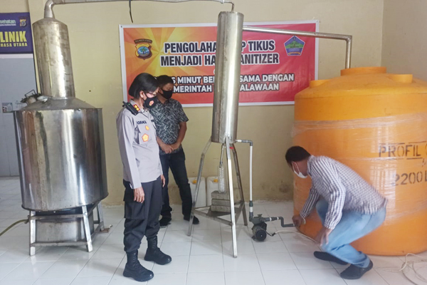 “Dalam pengolahan cap tikus menjadi hand sanitizer ini kami bekerjasama dengan Pemerintah Desa Talawaan. Pengolahan menggunakan alat penyulingan,” kata Kapolres.
