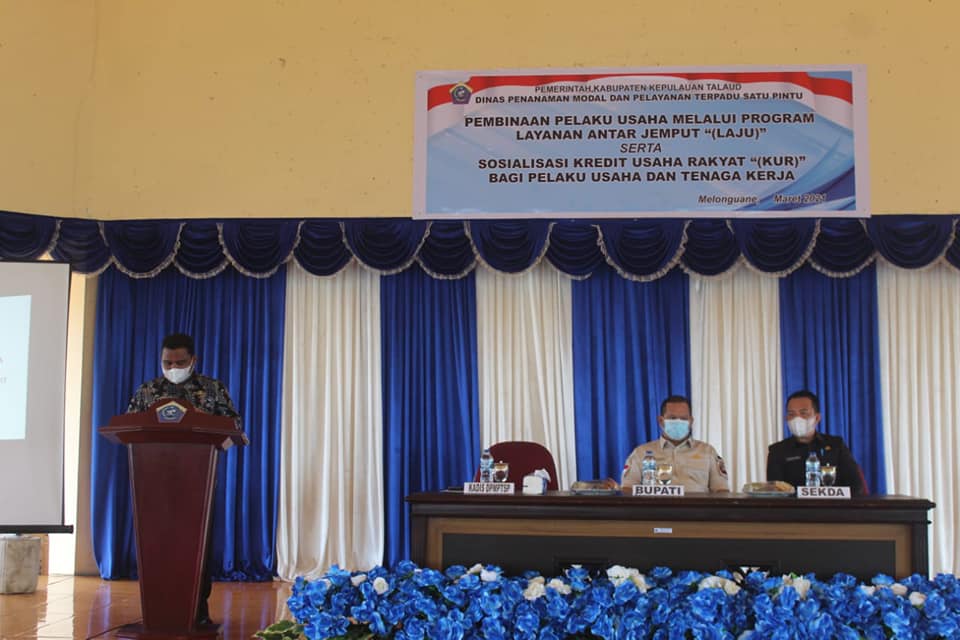 SUARASULUT.COM,TALAUD– Bupati Kepulauan Talaud dr. Elly Engelbert Lasut,ME membuka acara Pembinaan kepada pelaku usaha melalui program layanan antar jemput “(LAJU)” Serta melaksanakan sosialisasi kredit usaha Rakyat “(KUR)” Bagi pelaku usaha dan tenaga kerja di selenggarakan Dinas Penanaman Modal dan Pelayanan Terpadu Satu Pintu (DPM-PTSP).