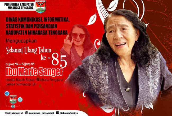 SuaraSulut.com, -Mitra – Jajaran Dinas Komunikasi, Informatika, Statistik dan Persandiaan (Diskominfo-SP), Kabupaten Minahasa Tenggara, mengucapkan selamat kepada ibunda terkasih dari Bupati James Sumendap, Ibu Marie Sumendap-Sanger, yang berulang tahun ke-85 hari ini, tepatnya Jumat 26 Maret 2021.