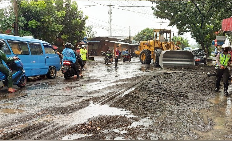 Arus lalu lintas sempat terhenti sejenak dikarenakan Loader sementara melakukan pembersihan pasir yang sudah meluber naik sampai ke jalan.