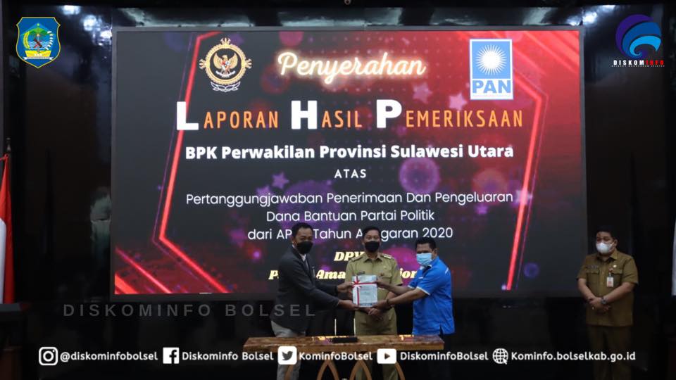 Dalam kegiatan ini, Wabup Deddy Abdul Hamid menerima buku LHP Pertanggungjawaban Dana Banparpol yang diserahkan langsung oleh Kepala Perwakilan BPK Prov. Sulut Karyadi, SE.