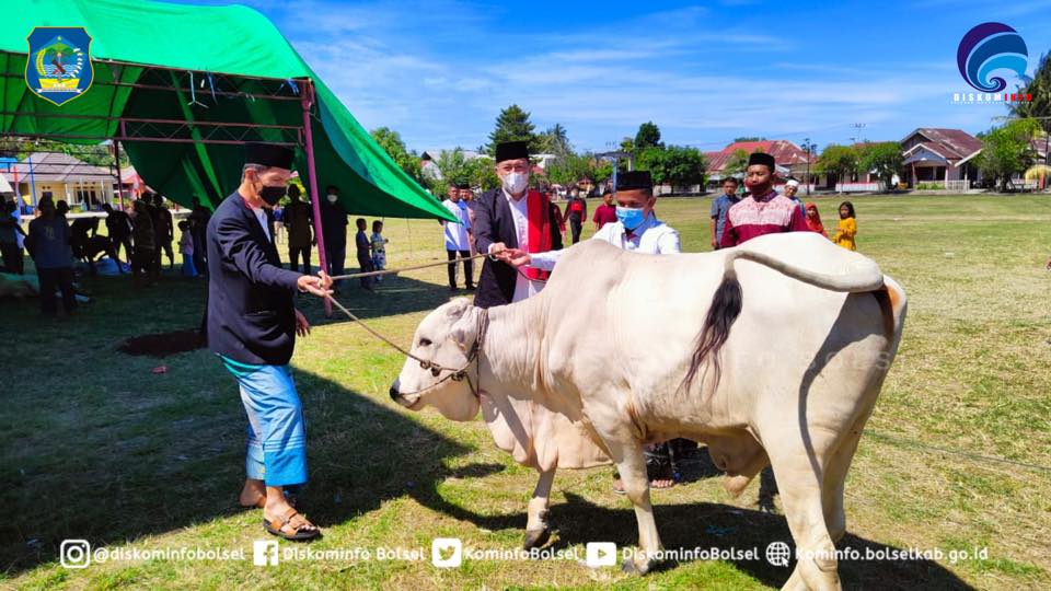 SUARASULUT.COM,BOLSEL-Bupati H. Iskandar Kamaru SPt melaksanakan Ibadah Sholat Idul Adha dan memantau Penyembelihan Hewan Kurban di Masjid Desa Milangodaa Kecamatan Tomini pada Selasa (20/07/2021).