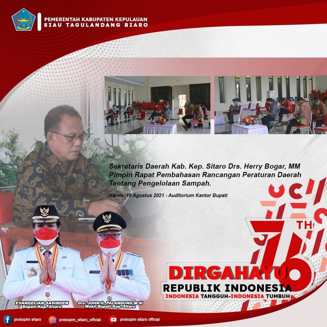 SUARASULUT.COM,SITARO—Sekretaris Daerah Kab. Kep. Sitaro Drs. Herry Bogar, MM memimpin Rapat Pembahasan Rancangan Peraturan Daerah Tentang Pengelolaan Sampah. Hal ini merupakan tindaklanjut dari Surat Ketua DPRD Nomor 88/DPRD/VII/2021 Perihal Penyampaian Ranperda dan Naskah Akademik.