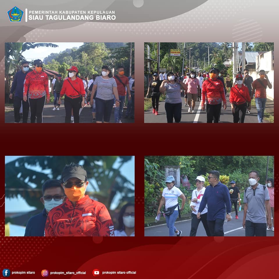 SUARASULUT.COM,SITARO–Bupati Kepulauan Sitaro, Evangelian Sasingen, bersama dengan Ketua TP PKK Kabupaten Sitaro, Diane Palandung Kamu, SE, Asisten Administrasi Umum Sekda, Drs. Denny D. Kondoj, MSi, Staf Ahli Bupati, Kepala OPD, Kepala Bagian Setda serta ASN yang mendapatkan Jadwal WFO, melaksanakan kegiatan Olahraga Jalan Sehat bersama star dari Kompleks Kantor Bupati Kepulauan Sitaro dan finish di Cafe Sunset Boulevard Kelurahan Ondong Kecamatan Siau Barat.
