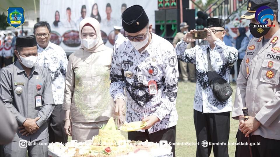 SUARASULUT.COM,BOLSEL—Bupati H. Iskandar Kamaru SPt pimpin upacara peringatan Hari Kesehatan Nasional ke-57, peringatan HUT PGRI ke-76 dan Hari Guru Nasional Tahun 2021 yang dipusatkan di Lapangan Olahraga Desa Mamalia Kecamatan Posigadan.