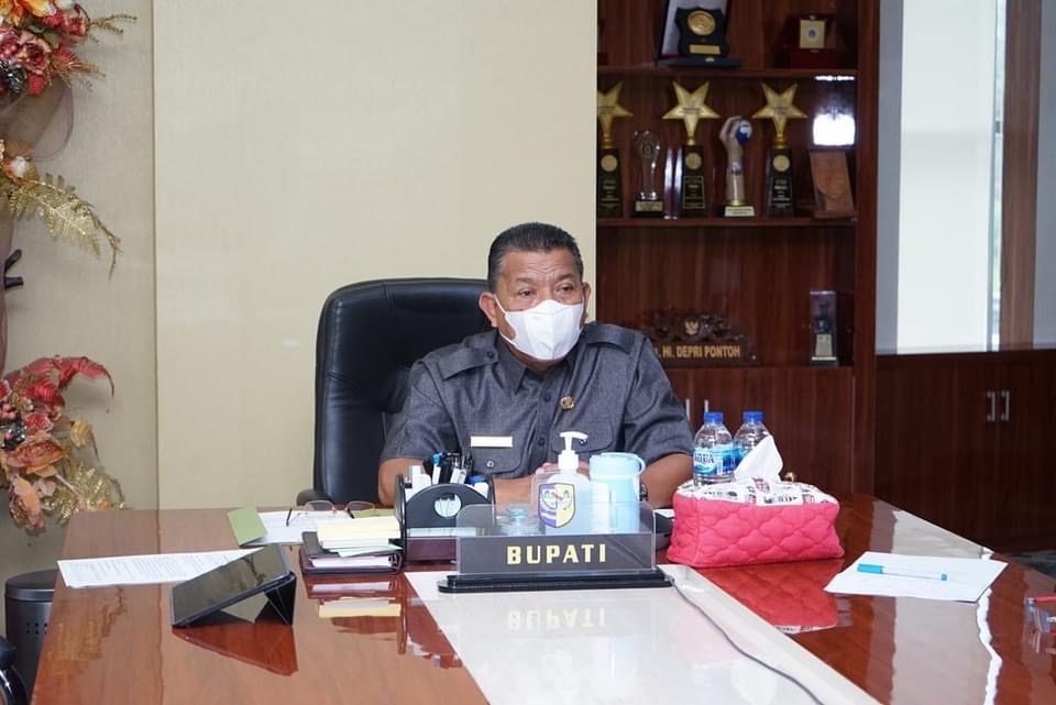 SUARASULUT.COM,BOLMUT—Bupati Bolaang Mongondow Utara Drs. H. Depri Pontoh Menghadiri Rapat Kesiapan Penerapan PPKM Natal 2021 dan Tahun Baru 2022, Percepatan Vaksinasi Serta Belanja Daerah (APBD) Secara Virtual (Online) diruang Kerja Bupati Bolaang Mongondow Utara.
