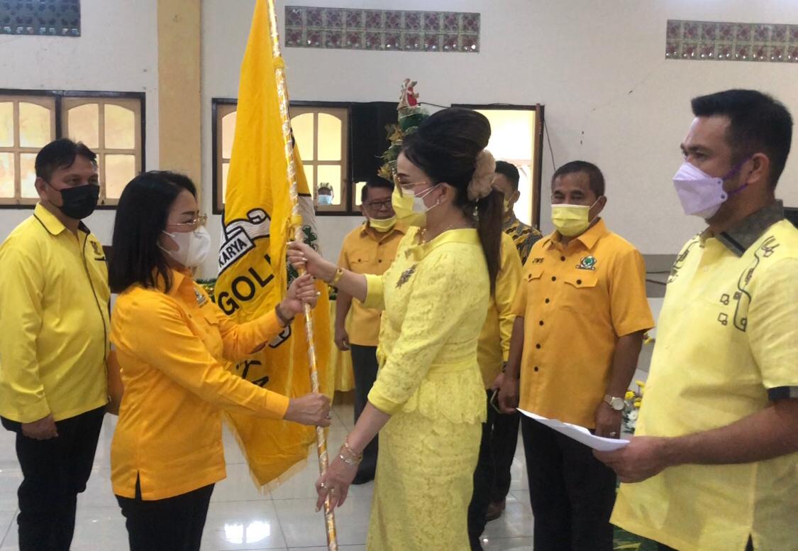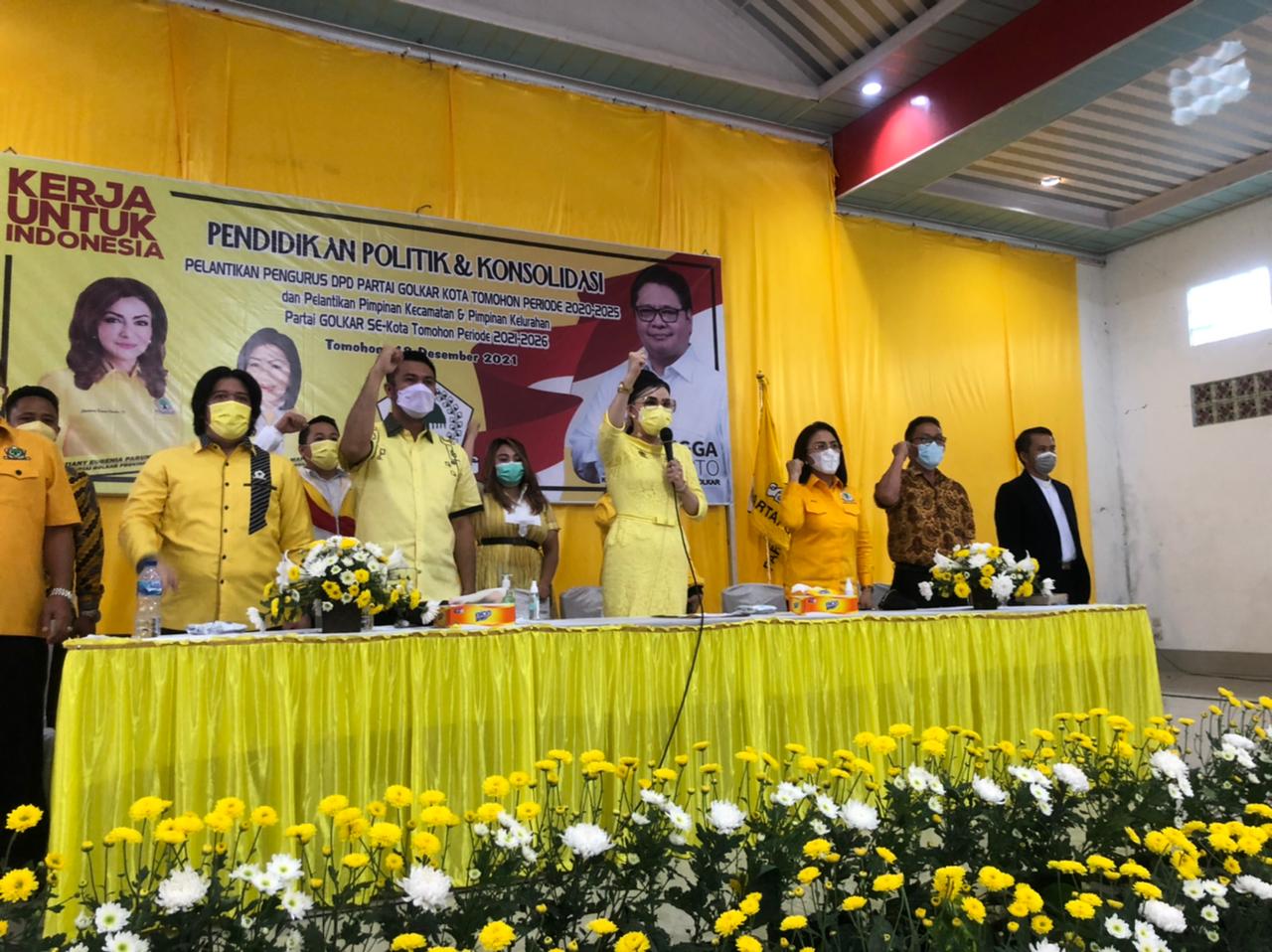 Ketua DPD 1 Partai Golongan Karya (PG) Sulut Christiany Eugenia Paruntu melantik pimpinan DPD ll Partai Golkar Kota Tomohon periode 2020-2025, di aula Kristianitas, Sabtu (18/12/21).