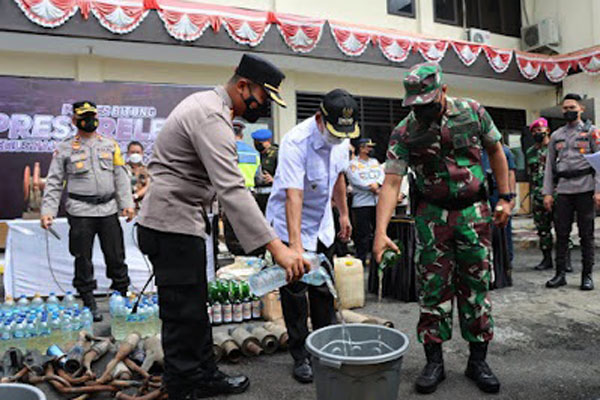 Barang bukti yang dimusnahkan terdiri dari 725 botol atau sekitar 435 liter miras jenis cap tikus, kemudian 24 botol bir, serta 75 buah knalpot non standar.