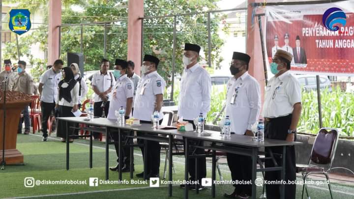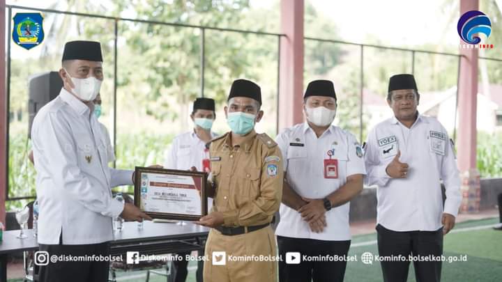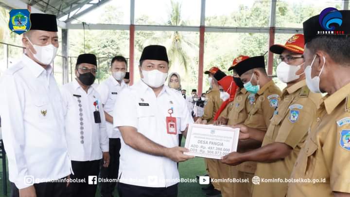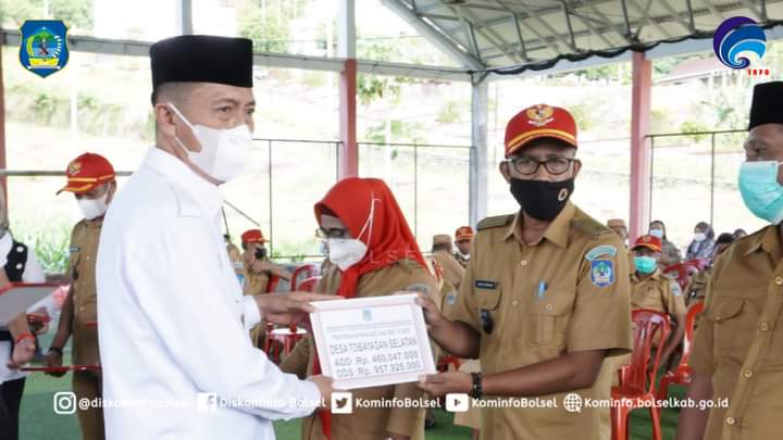 Bolsel–Bupati H. Iskandar Kamaru SPt menyerahkan Pagu Alokasi Dana Desa (ADD) dan DDS T.A 2022 kepada para Sangadi se-Kab. Bolsel yang dirangkaikan dengan acara Penyerahan Piagam Penghargaan atas Partisipasi dalam Festival Maleo Pemkab Bolsel di lapangan Futsal, Kawasan Perkantoran Panango pada Rabu (05/01/2022).