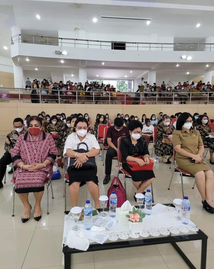 Minahasa–Ketua Komisi Wanita/Kaum Ibu (W/KI) Sinode GMIM, Pnt. Dra Adriana Dondokambey, M.Si menghadiri Ibadah Syukur Natal 2021 dan Tahun Baru 2022 Kerukunan Ketua-ketua Wilayah (K3W) dan Kerukunan Keluarga Pendeta dan Guru Agama (KKPGA) GMIM Rayon Minahasa Utara di Aula Mapalus Kantor Gubernur Sulawesi Utara.