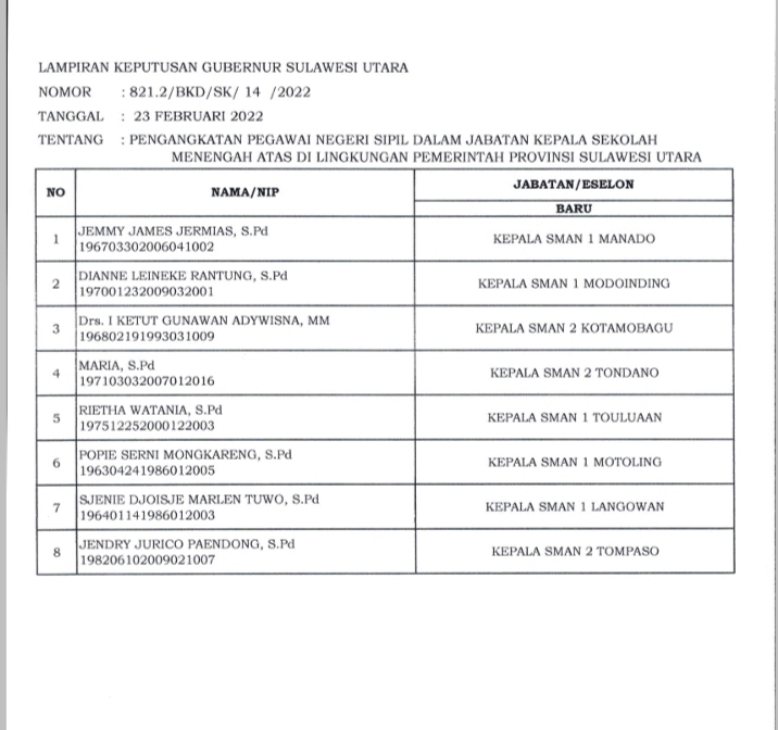 Sebanyak sembilan jabatan admistrator, delapan jabatan kepala sekolah dan dua jabatan fungsional (daftar pejabat dilantik lihat tabel).
