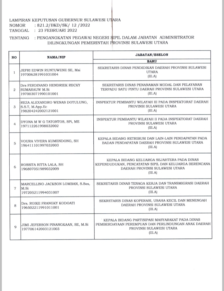 Manado– Rolling jabatan lingkup Pemerintah Provinsi Sulawesi Utara, terus dilakukan Gubernur Sulut Olly Dondokambey dan Wakil Gubernur Steven Kandouw.