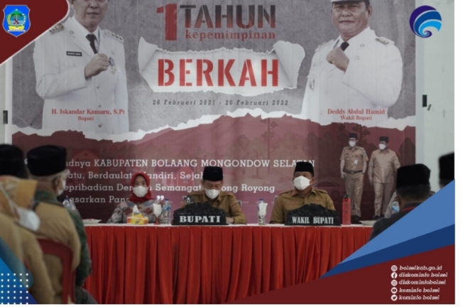 Bolsel–Setelah rangkaian acara Isra’ Mi’raj dan Syukuran 1 Tahun, Bupati H. Iskandar Kamaru S.Pt dan Wabup Deddy Abdul Hamid menggelar Rapat Kerja Evaluasi 1 Tahun Kepemimpinan Bupati dan Wakil Bupati di ruang Rapat Kepala Daerah, Lantai 2 Kantor Bupati, Kawasan Perkantoran Panango pada Selasa (01/03/2022).