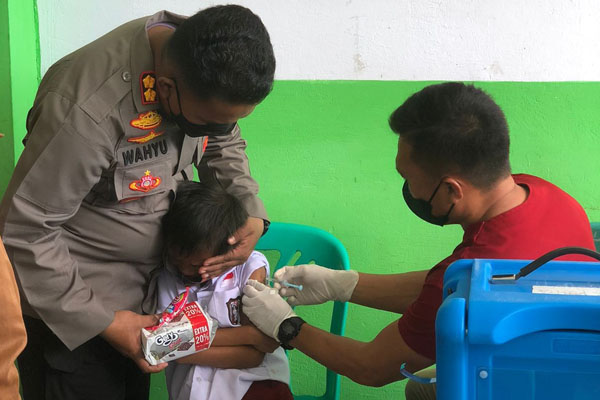 “Adik tenang saja ya, jangan takut, ini tidak sakit. Vaksinasi ini penting, untuk melindungi adik dari Covid-19,” ujar AKBP Wahyu memotivasi, sambil mendekap anak tersebut.