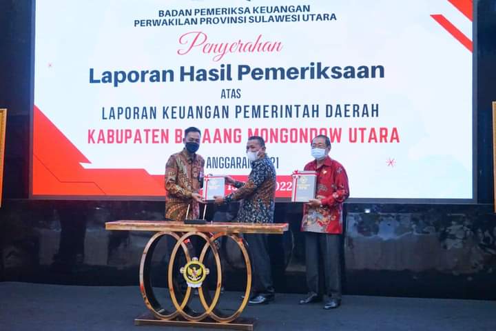 Bolmut– Bupati Bolaang Mongondow Utara Drs. Hi Depri Pontoh menghadiri penyerahan Laporan Hasil Pemeriksaan (LHP) dari Laporan Keuangan Pemerintah Daerah (LKPD) Tahun 2021 yang bertempat di aula Badan Pemeriksa Keuangan Republik Indonesia Perwakilan Provinsi Sulawesi Utara.
