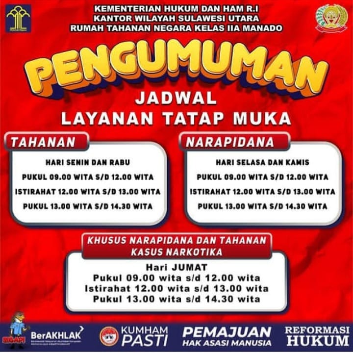 Menurut Yusep, layanan kunjungan di Rutan Manado resmi diberlakukan sejak Rabu, 6 Juni 2022 dengan jadwal hari pertama untuk Tahanan dan Kamis buat Narapidana. Dan Jumat ini buat Khusus Narapidana dan Tahanan Kasus Narkotika.