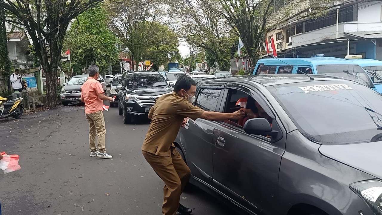 Manado–MemperingatiHari Ulang Tahun (HUT) (RI) Ke-77 SMP Negeri 1 Manado bagikan 2000 bendera Merah Putih di Pinggir Jalan Kepada Masyarakat Yang Melintas.