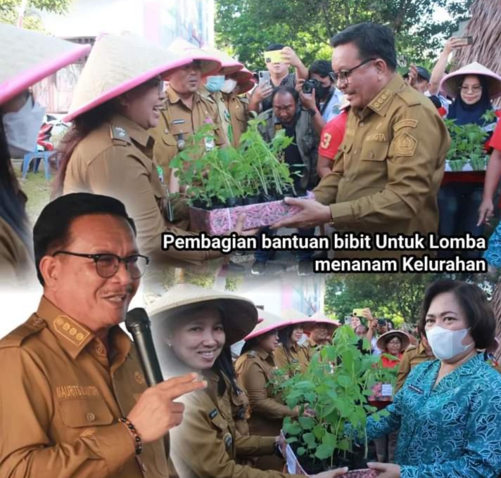 Wali Kota Bitung Ir. Maurits Mantiri, M.M bersama Ketua TP-PKK Kota Bitung, Rita A. L. Mantiri -Tangkudung, melaksanakan pembagian bantuan bibit Untuk Lomba Menanam Kelurahan