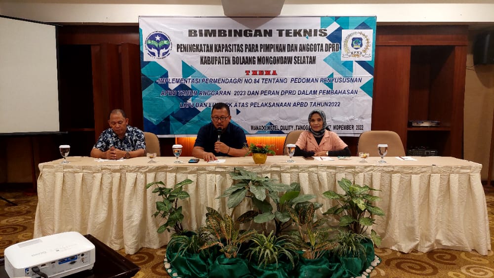 Bolsel-Dewan Perwakilan Rakyat Daerah (DPRD) Kabupaten Bolaang Mongondow Selatan Gelar Bimbingan Teknis (biktek) bagi pimpinan dan anggota DPRD terkait Peraturan Dalam Negeri (Permendagri) No 84 tentang mengenai pedoman penyusunan anggaran dan pendapatan belanja daerah (APBD) tahun 2023 serta peran DPRD dalam pembahasan LKPJ dan LHO BPK atas pelaksanaan APBD tahun 2022, bertempat di Quality Hotel Manado.