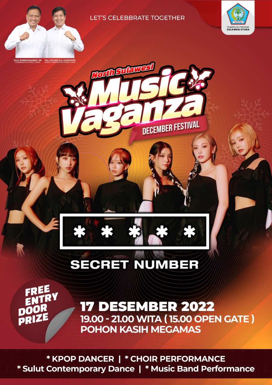 Manado – Kabar gembira bagi masyarakat Sulawesi Utara. Untuk Konser musik bertajuk “North Sulawesi Music Vaganza December Festival” yang akan digelar pada 17 Desember 2022 mendatang, Gubernur Sulut Olly Dondokambey dan Wakil Gubernur Sulut Steven Kandouw (ODSK) akan mendatangkan Grup band beraliran K-pop asal Korea selatan, Secret Number.