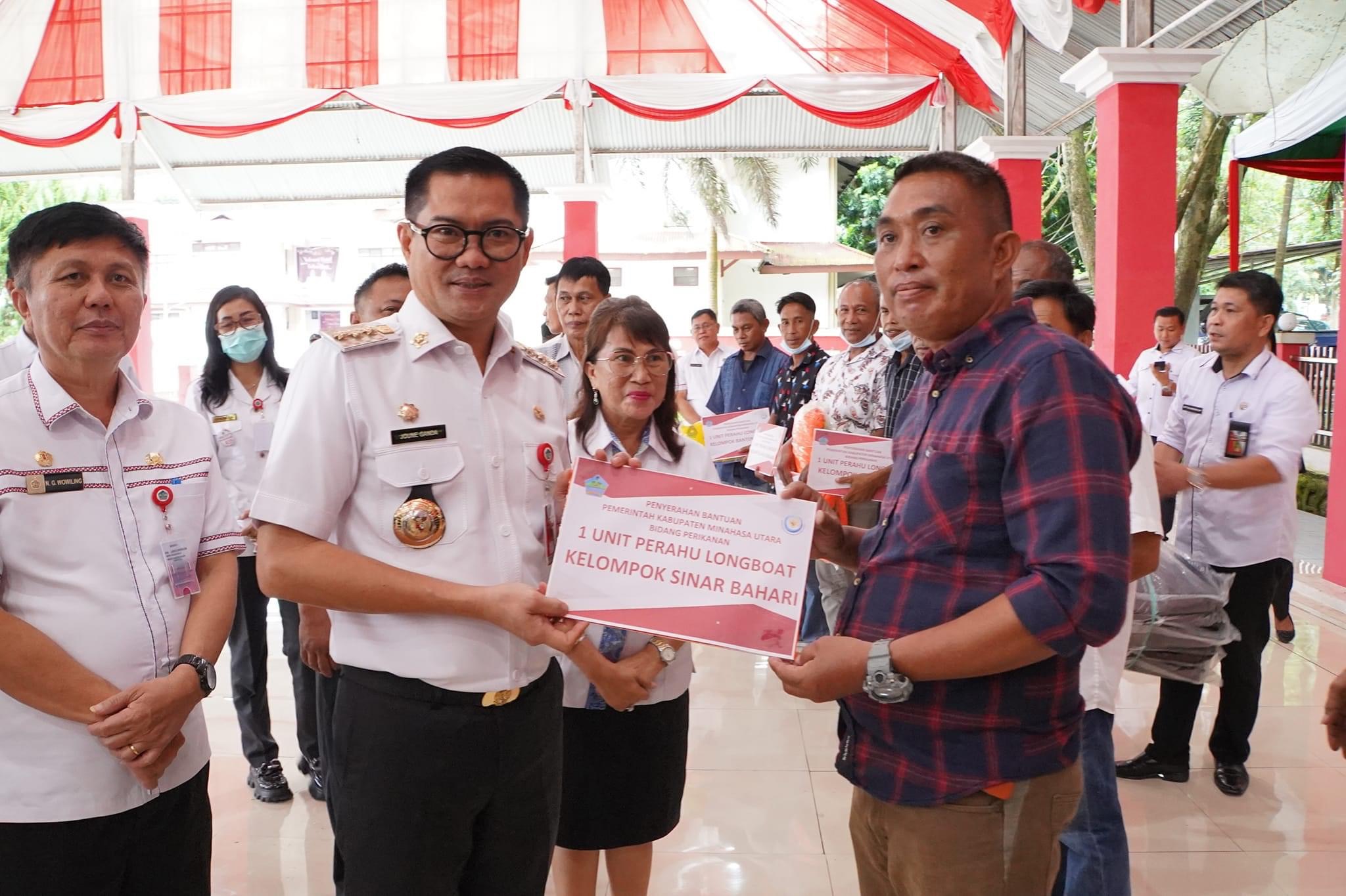 Minut–Bantuan untuk masyarakat ini diserahkan langsung oleh Bupati Joune J.E. Ganda, S.E., M.A.P di Pendopo Kantor Bupati, secara simbolis kepada perwakilan kelompok untuk bantuan Budidaya Rumput Laut, Budidaya Ikan Payau, Perahu Ketinting, Long Boat dan Mesin tempel 15 PK.