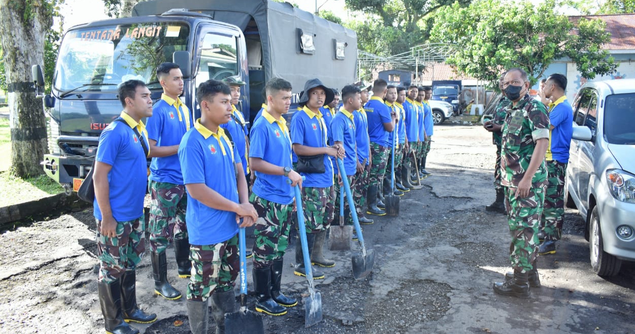 Suarasulut, Manado – TNI termasuk didalamnya TNI AU kolaborasi Pemerintah Minahasa Utara serta masyarakat giat kebersihan rumah warga bencana banjir, di Talawaan, Minahasa Utara, Senin (30/01/2023).