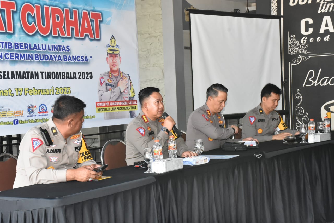 “Dengan kegiatan jumat curhat, masyarakat atau para undangan yang hadir bisa memberikan saran dan mendengarkan solusi permasalahan di sektor lalu lintas angkutan jalan raya,  khususnya pada Operasi Keselamatan Tinombala 2023. ” Kata Dirlantas Polda Sulteng Kombes Polisi Kingkin Winisuda.