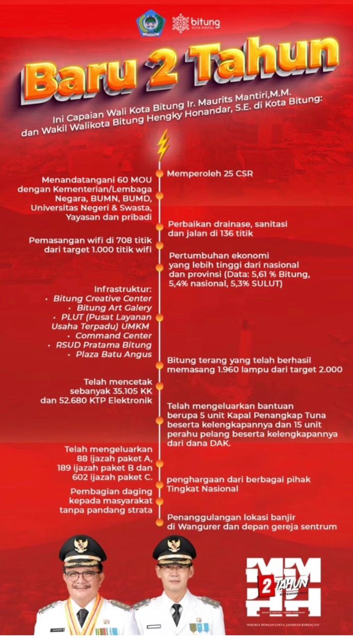 Selamat atas dua tahun kepemimpinan MM-HH, yang terus memberikan yang terbaik untuk warga Kota Bitung. Salam Sukses Selalu Untuk Walikota Bitung, Ir.Maurits Mantiri.MM dan Wakil Wali Kota Bitung, Hengky Honandar,SE. (FP/Adv)