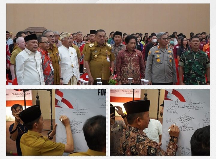 Kemudian dilanjutkan dengan Kegiatan penandatanganan Deklarasi Pemilu Damai 2024 oleh Gubernur, Ketum FKUB dan para Kepala Daerah yang hadir.