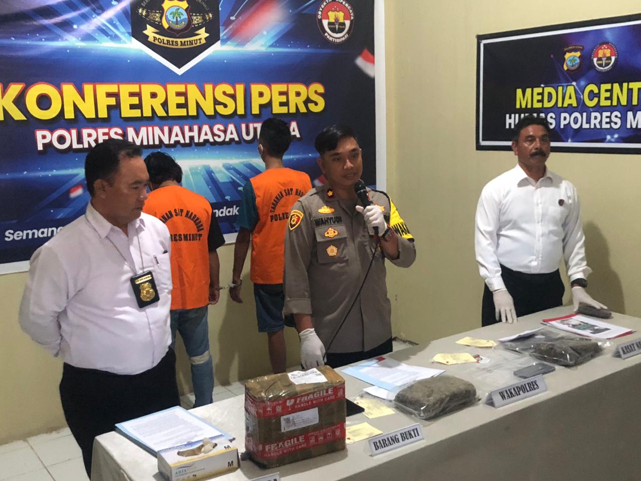 Mewakili Kapolres Minut AKBP Dandung Putut Wibowo, SIK., Waka Polres Kompol Sugeng Wahyudi Santoso, SIK menyampaikan pengungkapan dan penangkapan adanya pengiriman paket ganja dari Deli Serdang, itu berdasarkan dengan adanya informasi masyarakat yang dikirim melalui pesawat via Bandara Soekarno, Jakarta, menuju Sam Ratulangi Manado.