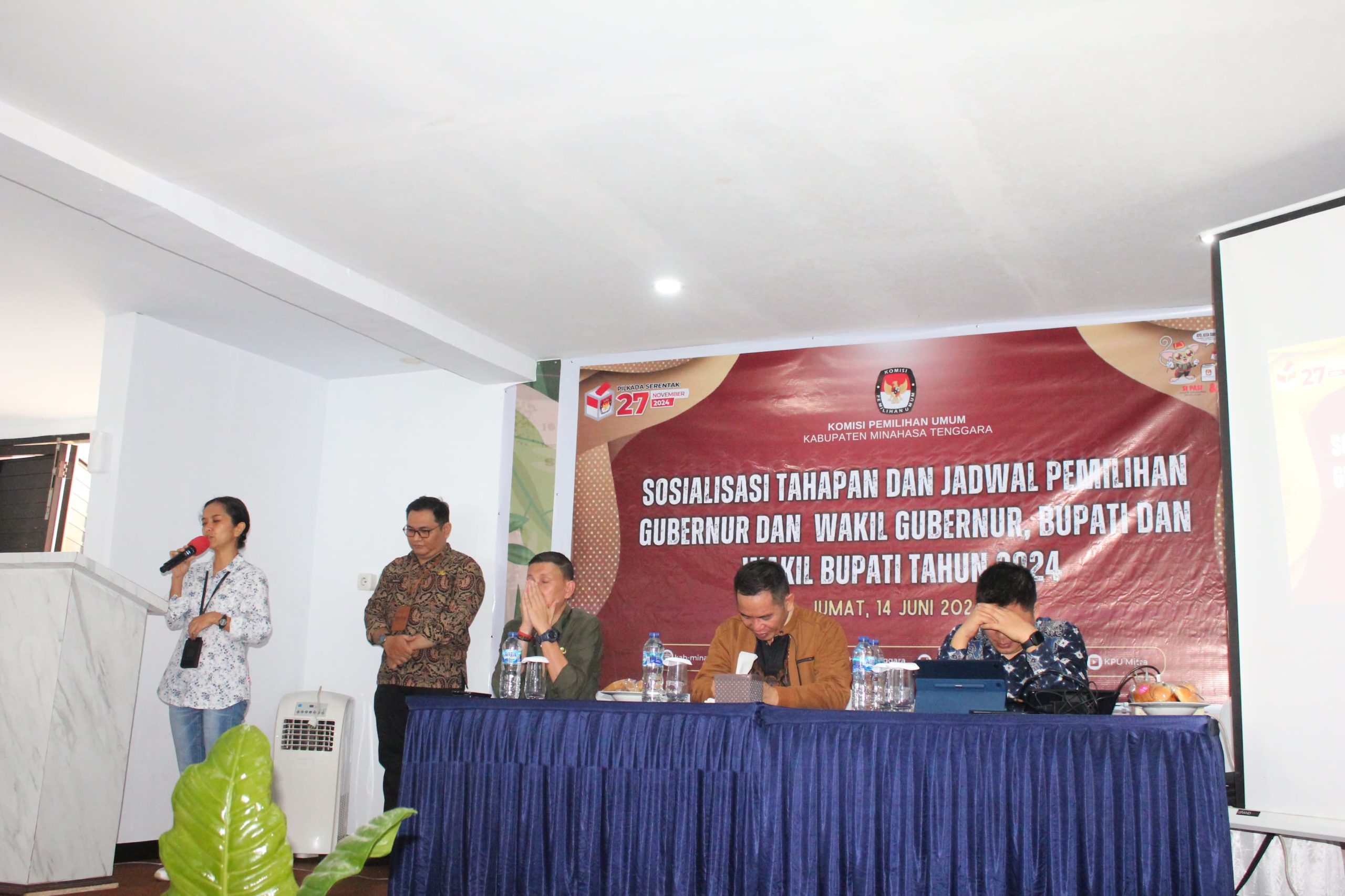 SUARASULUT.COM, Ratahan- Komisi Pemilihan Umum (Kpu) Kabupaten Minahasa Tenggara (Mitra) menggelar sosialisasi tentang tahapan dan jadwal Pilkada serentak 2024 di D’Jtos Ratahan, Jumat (14/6/2024).