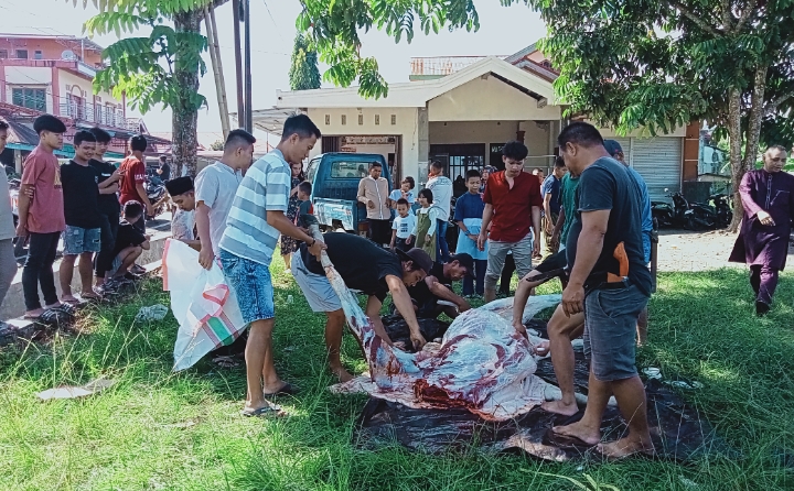 Penyembelihan hewan kurban ini dilakukan usai pelaksanaan shalat Idul Adha 1445 Hijriyah, di lapangan mini Kelurahan Matali, Senin 17 Juni 2024.