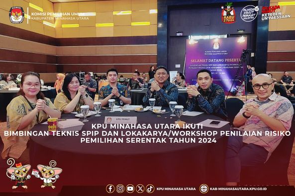 Manado-Komisi Pemilihan umum (KPU) Kabupaten Minahasa Utara mengikuti Bimbingan Teknis (Bimtek) SPIP dan Lokakarya/Workshop Penilaian Risiko (Risk Assessment) Pemilihan Serentak Tahun 2024, di Manado 12-14 Juli 2024.