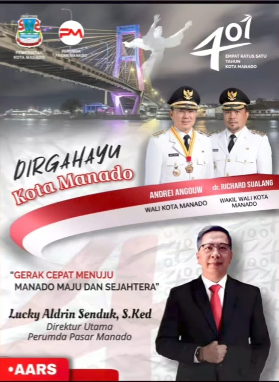 Perumda Pasar Manado HUT Ke-401 Kota Manado Juli 15, 2024Juli 16, 2024oleh Agung Sugiono-3108 Dilihatoleh Agung Sugiono Post Views: 3,108 Jangan LewatkanMusim Haji Tahun 2026, Gubernur Sulut Subsidi Biaya Lokal 5 Juta Satu Orang Jamaah HajiManado Jadi Percontohan Nasional, Digitalisasi Bansos Dimulai dari IKDHalo Pak UT Pejabat Pembina Kepegawaian, Begini Tanggapan Pakar Hukum Terkait Dugaan Perselingkuhan ASNMay Day Sulut Dipanaskan dari Sekarang: Panitia Digeber, Peran Dibedah TotalWawali Manado Temui MUI, Sinyal Penguatan Sinergi Pembangunan