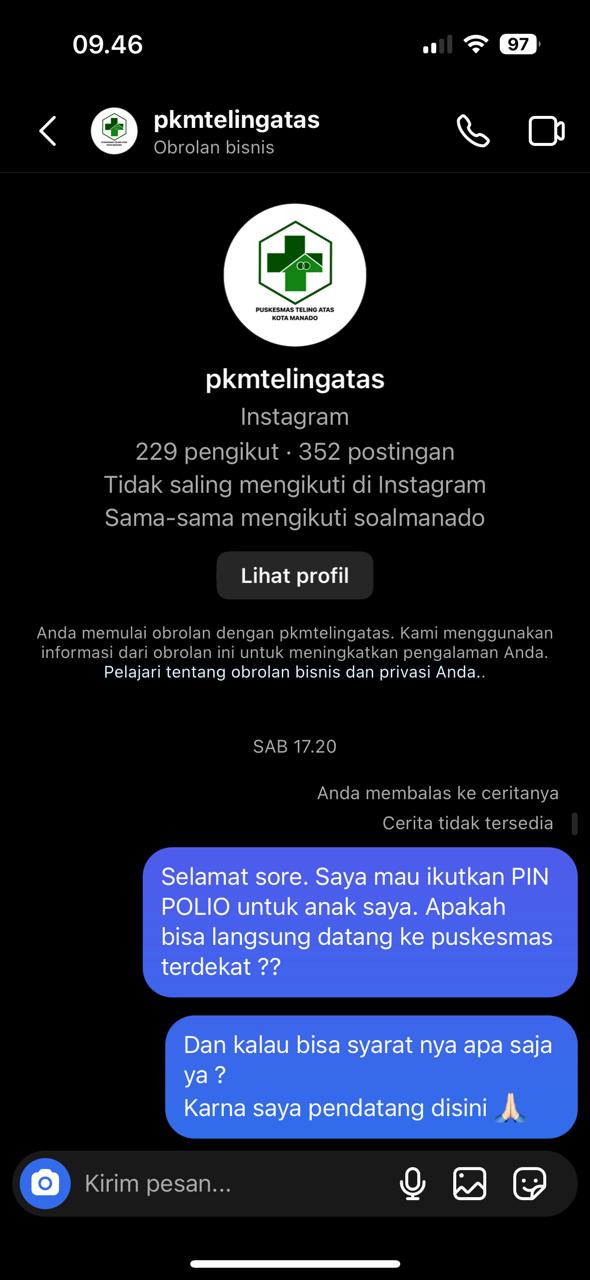 Lanjutnya sangat di sesali karena saat mendaftar melalui media sosial Puskesmas Teling tidak ada balasan atau responden langsung dari pihak mereka,” Torang so daftar duluan lewat Media sosial Instragram dan tidak ada jawaban sama sekali, karena Torang juga ada kesibukan makanya torang langsung ke Puskesmas dan tidak dilayani.”Terangnya dengan muka kecewa saat menjelaskan kepada wartawan media ini,