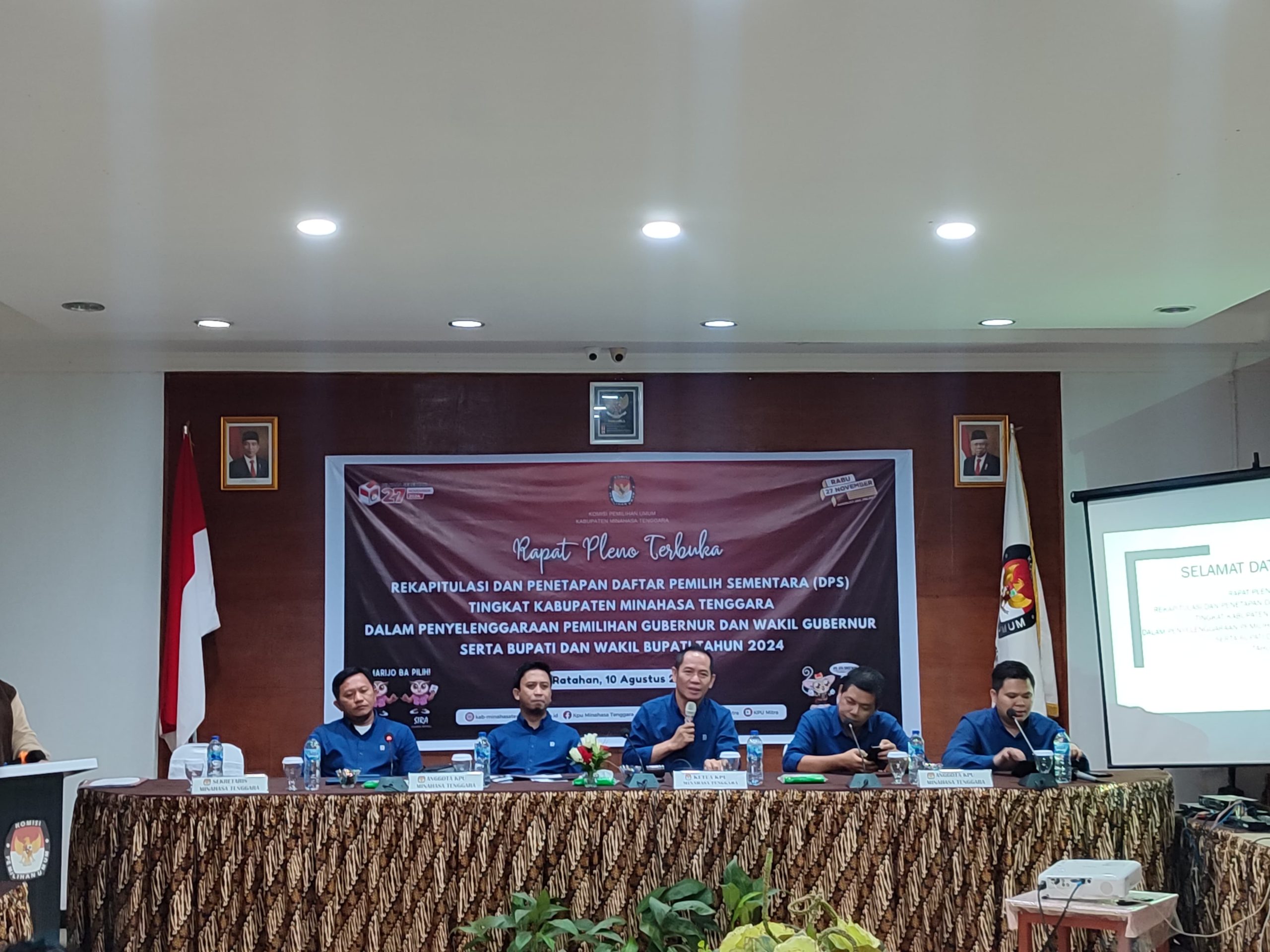 SUARASULUT.COM,Ratahan- Komisi Pemilihan Umum (KPU) kabupaten Minahasa Tenggara (Mitra) mengelar, Rapat Pleno terbuka. Terkait rekapitulasi dan Penetapan Daftar Pemilih Sementara (DPS) tingkat Kabupaten Minahasa Tenggara (Mitra) dalam Penyelenggaraan Pemilihan Gubernur dan Wakil Gubernur, serta Bupati dan Wakil Bupati. Bertempat di kantor KPU Mitra, Sabtu (10/8/2024)