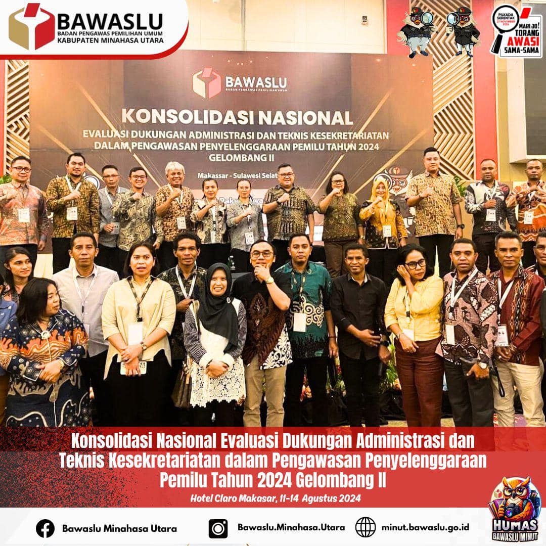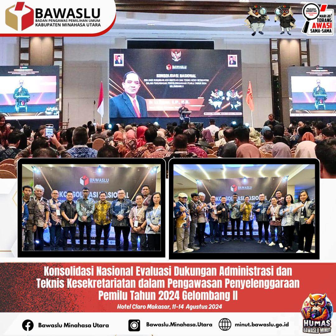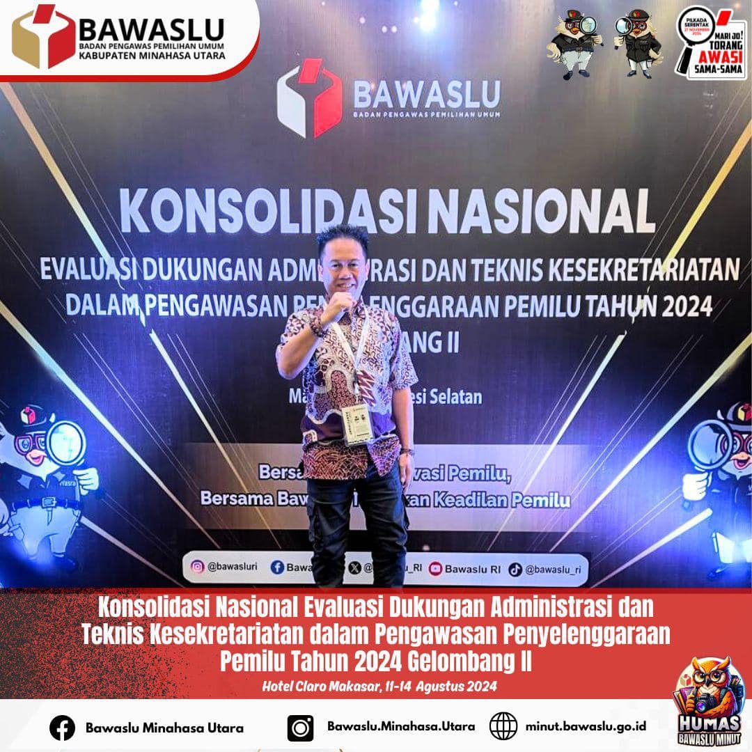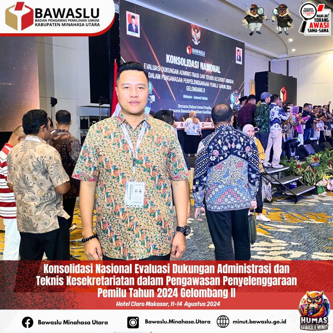 Makassar-Ketua Badan Pengawas Pemilu (Bawaslu) Minahasa Utara, Rocky Ambar dan Koordinator Divisi Penanganan Pelanggaran dan Penyelesaian Sengketa Waldi Mokodompit, bersama Koordinator Kesektariatan Bawaslu Minut, Michael SA Polii mengikuti Konsolidasi Nasional Evaluasi Dukungan Administrasi dan Teknis Kesekretariatan dalam Pengawasan Penyelenggaraan Pemilu Tahun 2024 Gelombang II, di Claro Hotel Makassar, Sulawesi Selatan, berlangsung Senin 11-14 Agustus 2024.