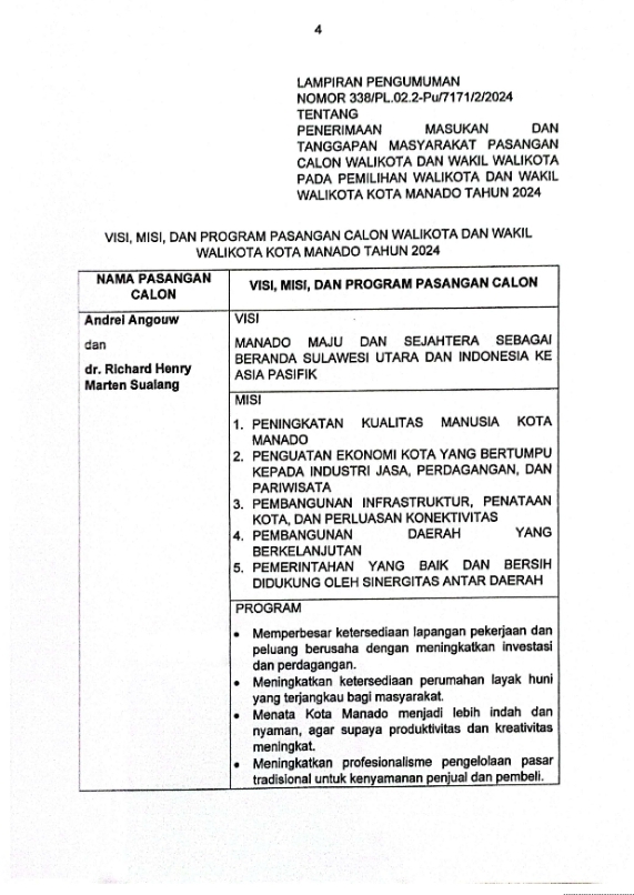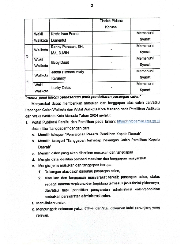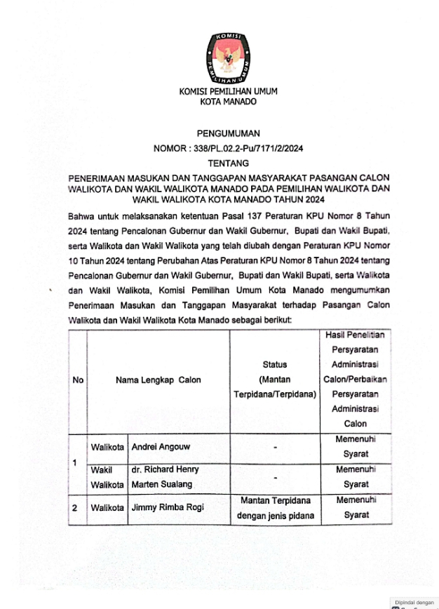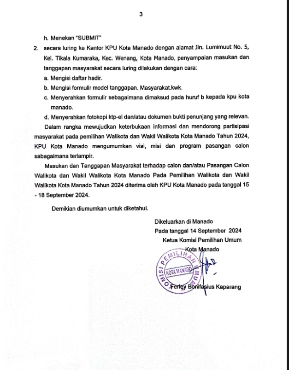 Manado, KPU Kota Manado mulai hari ini Sabu, (14/9/2024) mengumunkan secara resmi, menerima masukkan dan tanggapan masyarakat terhadap pasangan Calon Walikota dan Wakil Walikota Manado pada pemilihan Pilkada serentak Tahun 2024.