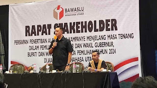Manado-Badan Pengawas Pemilu (Bawaslu) Kabupaten Minahasa Utara melaksanakan Rapat bersama dengan Stakeholder persiapan penertiban Alat Praga Kampanye (APK) menjelang masa tenang dalam pemilihan Gubernur dan Wakil Gubernur, Bupati dan Wakil Bupati pada pemilihan Tahun 2024 di Kabupaten Minahasa Utara. Hotel Peninsula Manado Sabtu, (23/11/2024).