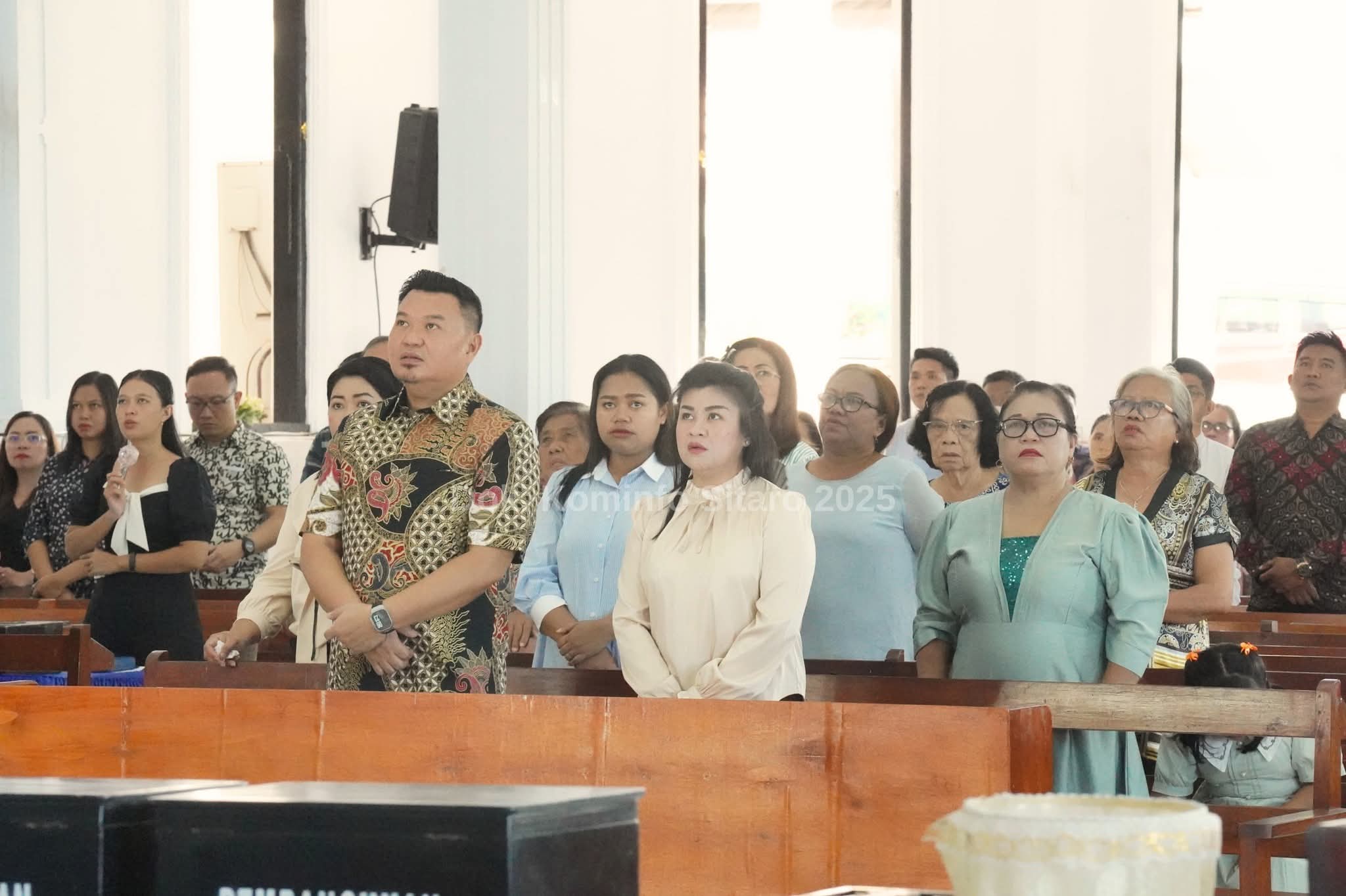 SITARO– Bupati Kepulauan Sitaro, Chyntia Kalangit bersama Reinol Tumbio beribadah minggu bersama di GMIST Jemaat Ulu Siau, Minggu (27/7/2025).
