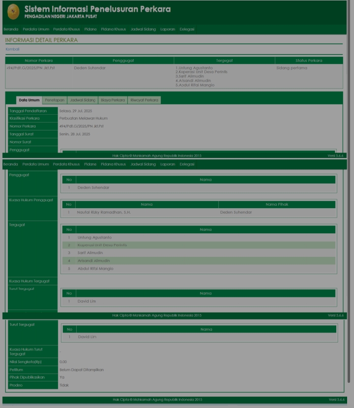 Berdasarkan data Sistem Informasi Penelusuran Perkara (SIPP) PN Jakarta Pusat, gugatan tersebut terdaftar pada 29 Juli 2025 dengan Nomor Perkara 494/Pdt.G/2025/PN Jkt.Pst.