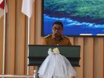 Heronimus Makainas menyampaikan laporan tentang perkembangan angka kemiskinan serta capaian program kegiatan penanggulan kemiskinan dan kemiskinan ekstrem tahun 2024 di Kabupaten Kepulauan Sitaro.