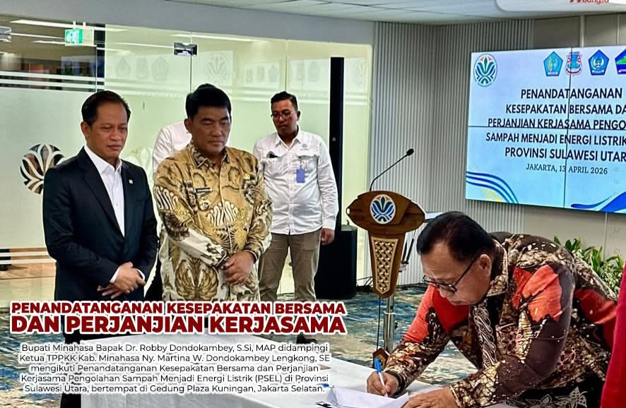 Bupati Minahasa, Dr. Robby Dondokambey, S.Si, MAP, bersama Ketua TP-PKK Kabupaten Minahasa, Ny. Martina W. Dondokambey Lengkong, SE, menghadiri penandatanganan kesepakatan bersama dan perjanjian kerja sama Pengolahan Sampah Menjadi Energi Listrik (PSEL) di Provinsi Sulawesi Utara.